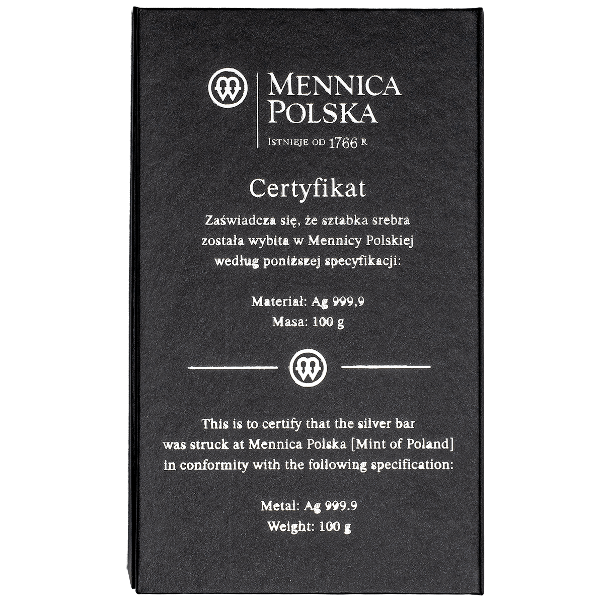Na srebrnej sztabce zostały wybite: masa, próba oraz współczesny znak Mennicy Polskiej, które stanowią potwierdzenie jej autentyczności.