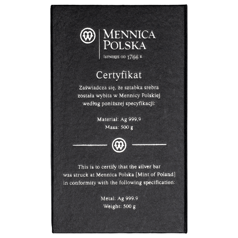 Na srebrnej sztabce zostały wybite: masa, próba oraz współczesny znak Mennicy Polskiej, które stanowią potwierdzenie jej autentyczności.