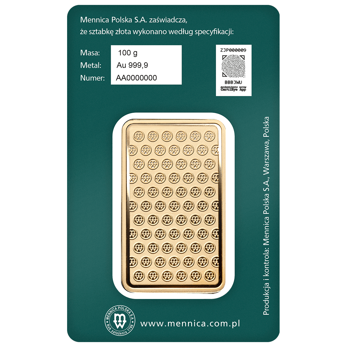 Sztabka o masie 100g sprzedawana jest w specjalnym opakowaniu gwarantującym jej autentyczność – CertiCard. Na opakowaniu podana jest specyfikacja sztabki – gramatura, zawartość złota oraz unikalny numer oferowanej sztabki. Na wizerunku sztabki znajduje się współczesny znak Mennicy Polskiej, a także masa sztabki oraz próba złota.
