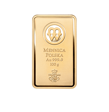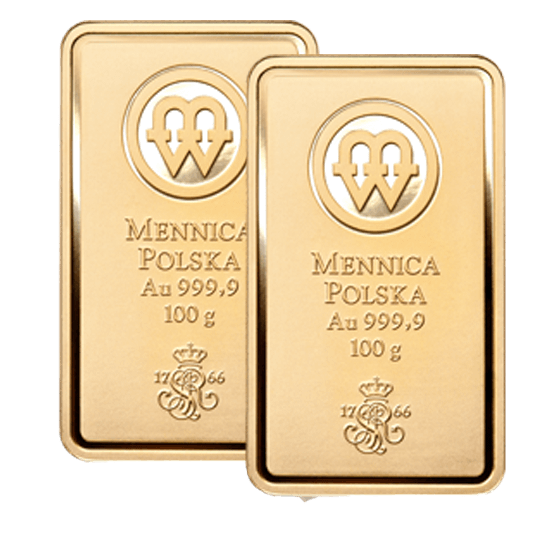 Dwie złote sztabki 100-gramowe w konkurencyjnej cenie. Sztabki są wybijane w Mennicy Polskiej. Można je pozostawić na przechowanie w skarbcu Mennicy Polskiej lub zlecić ich przesłanie kurierem pod wskazany adres na terenie Polski.