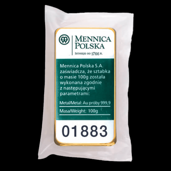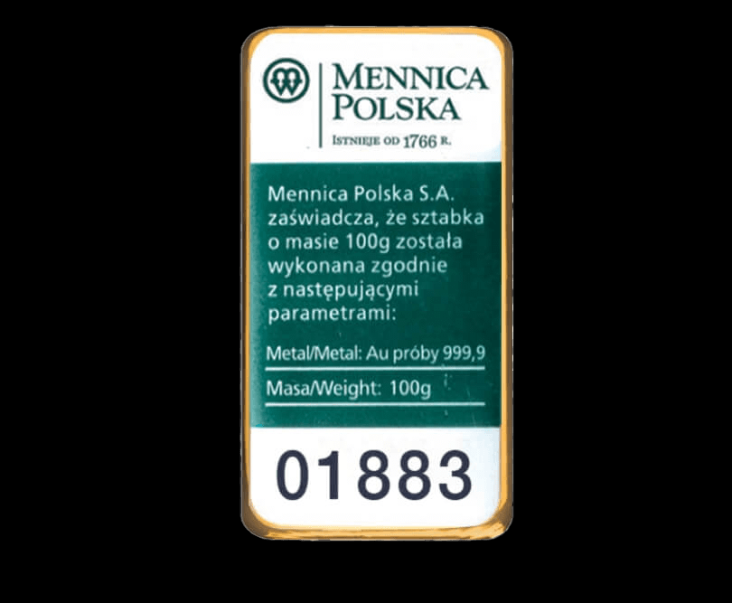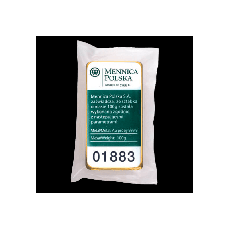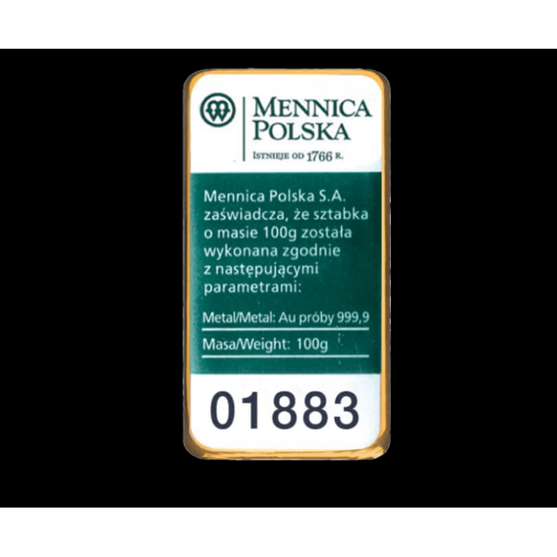 Sztabka o masie 100g, odlewana, zapakowana jest w folię. Na wizerunku sztabki znajduje się współczesny znak Mennicy Polskiej, próba złota, masa sztabki oraz unikalny numer zgodny z numerem na certyfikacie. Do każdej sztabki dołączany jest certyfikat gwarantujący jej autentyczność oraz zawierający jej specyfikację – gramaturę, zawartość złota oraz unikalny numer oferowanej sztabki. Opakowanie sztabki może nosić niewielkie ślady użytkowania, takie jak brak dodatkowej folii ochronnej czy drobne rysy na opakowaniu.