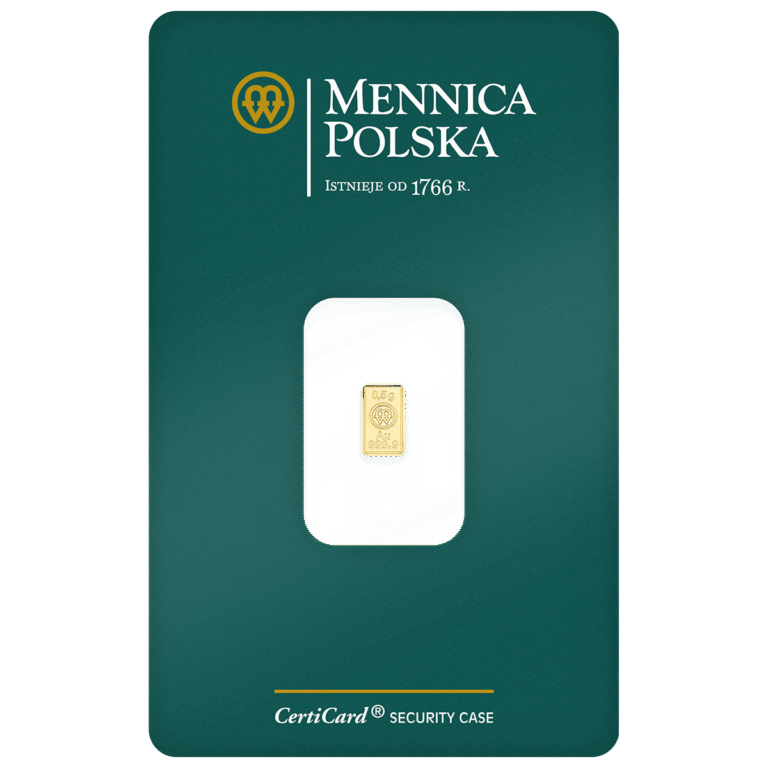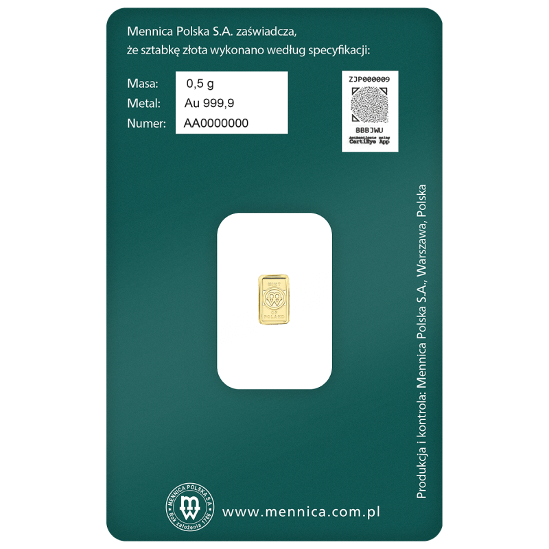 Sztabka o masie 0,5g sprzedawana jest w specjalnym opakowaniu gwarantującym jej autentyczność – CertiCard. Na opakowaniu podana jest specyfikacja sztabki – gramatura, zawartość złota oraz unikatowy numer. Na wizerunku sztabki znajduje się współczesny znak Mennicy Polskiej, a także masa sztabki oraz próba złota.