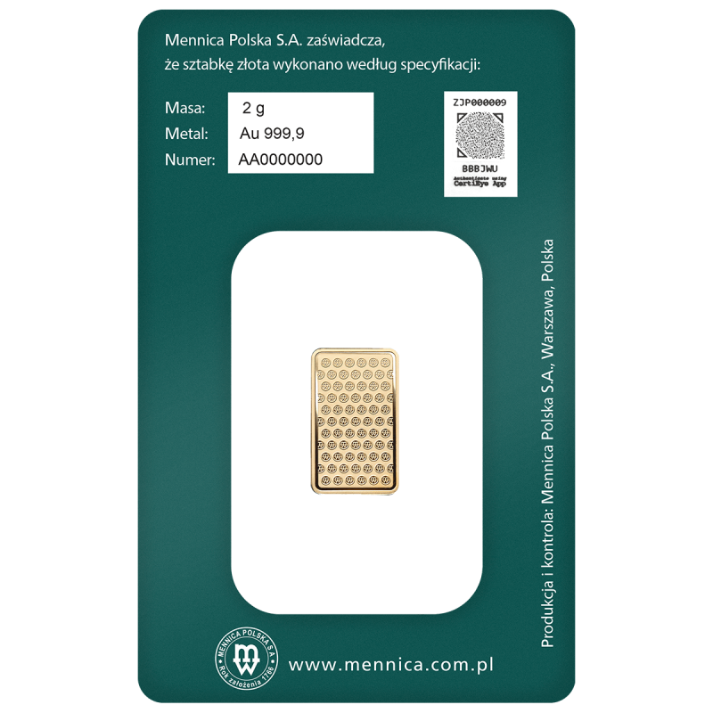 Sztabka o masie 2g sprzedawana jest w specjalnym opakowaniu gwarantującym jej autentyczność – CertiCard. Na opakowaniu podana jest specyfikacja sztabki – gramatura, zawartość złota oraz unikalny numer oferowanej sztabki. Na wizerunku sztabki znajduje się współczesny znak Mennicy Polskiej, a także masa sztabki oraz próba złota.